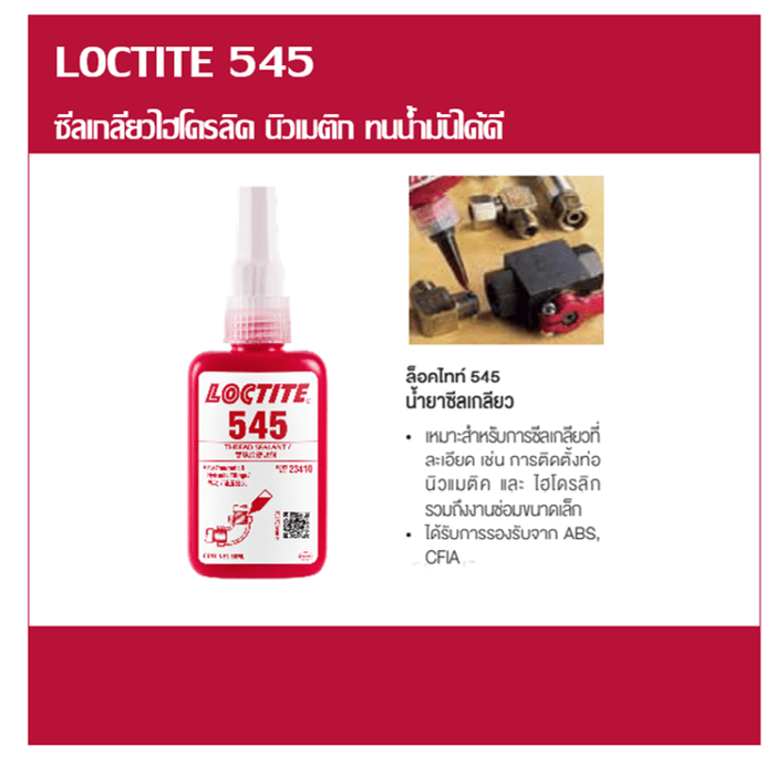 น้ำยาซีลเกียวล็อคไทท์สามารถแก้ปัญหาได้จากสาเหตุจริงๆ น้ำยาสามารถเติมเต็มช่องว่างในเกลียวได้ 100% และช่วยลดปัญหาเรื่องการรั่วซึมจากการใช้งานในระยะเวลานาน ช่วยยึดติดบริเวณเกลียวไม่ให้เกิดการคลายตัวได้ และทนต่อแรงสั่นสะเทือนของเครื่องจักร แรงดันสูงและสารเคมีต่างๆได้ดี