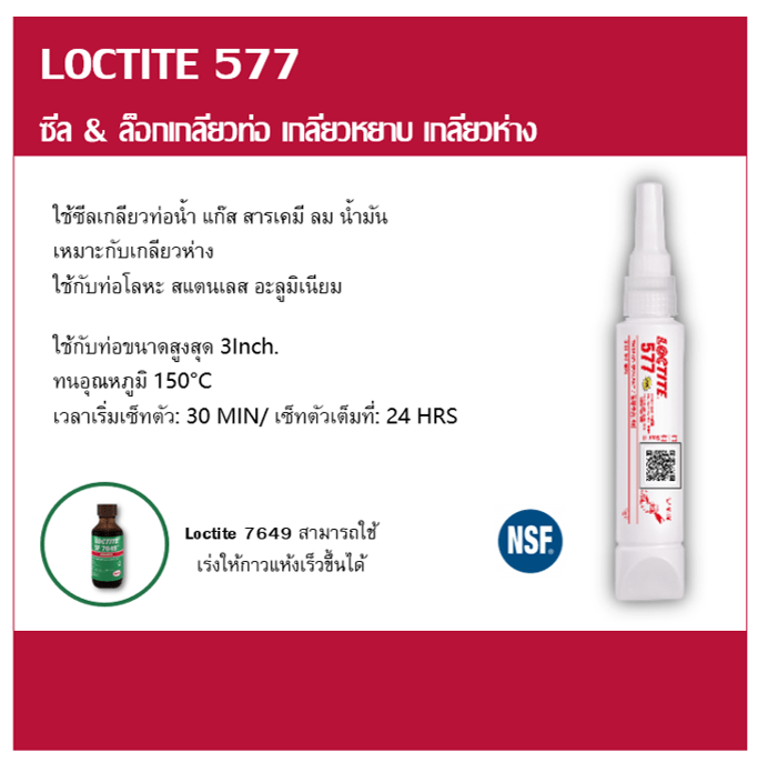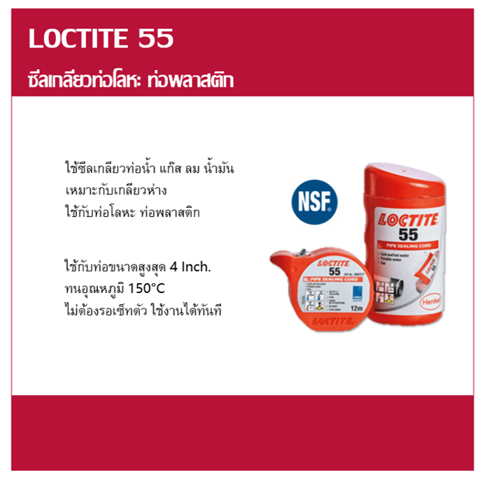 เชือกซีลเกียวล็อคไทท์ 55 เป็นเชือกเส้นเล็กๆ มีความพิเศษที่ความแข็งแรง เหนียว และมีน้ำยาซีลพิเศษมาด้วย ทำให้เชือกนี้สามารถคลอบคลุมและซีลได้เต็มช่องว่างในเกลียว สามารถใช้กับท่อ PVC และพลาสติกได้ ไม่ต้องรอให้กาวแห้งสามารถใช้งานได้ทันทีหลังจากที่ประกอบ สามารถปรับแต่งท่อได้หลังจากที่ประกอบท่อไปแล้ว