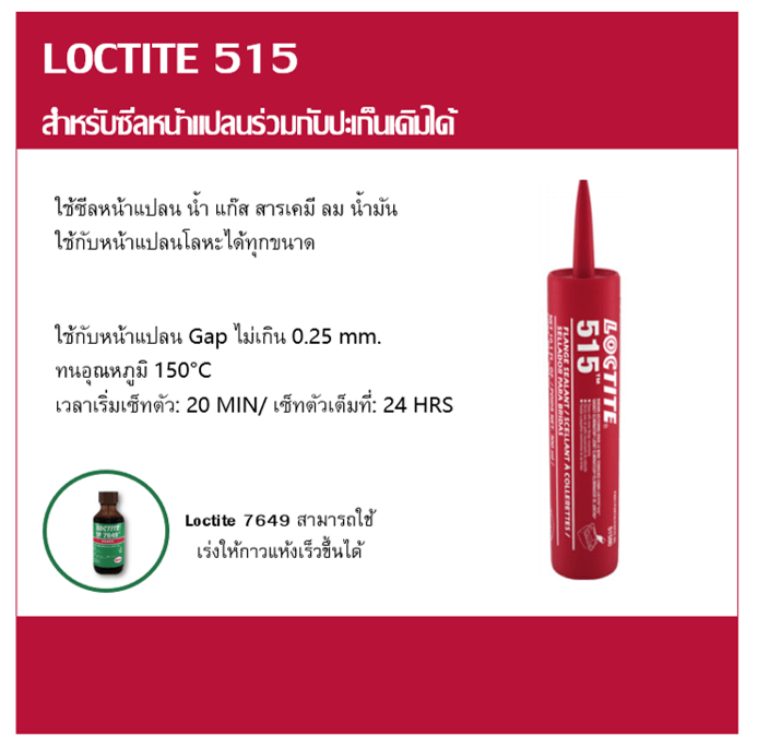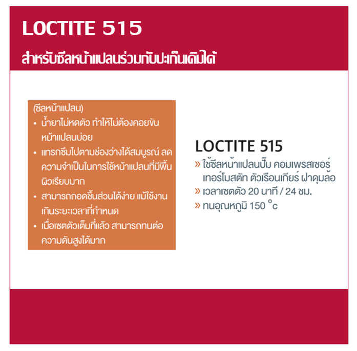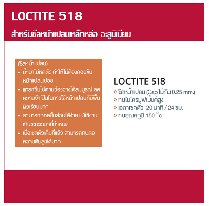ปะเก็นเหลวล็อคไทท์จะทำให้เกิดการเติมเต็มช่องว่างระหว่างหน้าแปลนโลหะ และแทรกซึมไปยังช่องว่าง ร่อง ริ้ว รอยเล็กๆของหน้าแปลนได้ ทำให้เครื่องจักรสามารถใช้งานได้ยาวนานขึ้น ป้องกันการรั่วซึมระหว่างใช้งาน ป้องกันการเกิดสนิมที่ผิวหน้าแปลน ไม่กัดหรือทำลายพื้นผิว